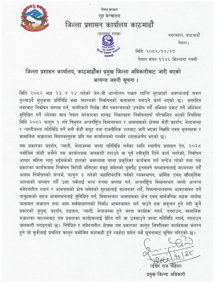 काठमाडौंका प्रमुख जिल्ला अधिकारी ईश्वरराज पौडेलद्वारा जारी गरिएको सूचनामा भनिएको छ, ‘विमानस्थल प्रवेश गर्ने गोल्डेन गेटदेखि विमानस्थल परिसर क्षेत्रभित्रको सम्पूर्ण सडक, आन्तरिक टर्मिनल क्षेत्र, अन्तर्राष्ट्रिय टर्मिनल क्षेत्र, पार्किङ क्षेत्रलगायतको विमानस्थल हाताभित्रको सम्पूर्ण क्षेत्रमा पाँच जनाभन्दा बढी व्यक्ति भेला भई अनसन, धर्ना, घेराउ, जुलुस, प्रदर्शन तथा सभा जस्ता विरोधका कार्यक्रम गर्न निषेधको आदेश जारी गरिएको छ ।’