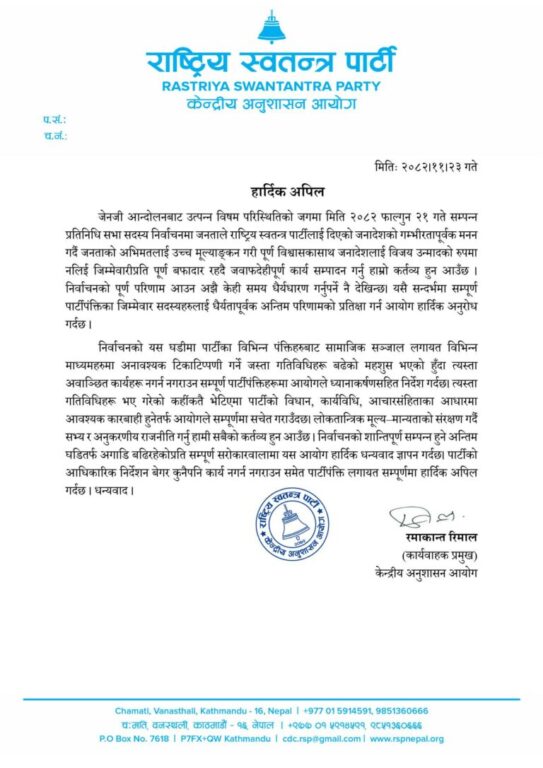 काठमाडौं । राष्ट्रिय स्वतन्त्र पार्टी (रास्वपा) ले निर्वाचनको पूर्ण परिणाम आउन अझै केही समय लाग्ने भएकाले आफ्ना सबै पार्टीपंक्तिलाई धैर्यपूर्वक प्रतीक्षा गर्न आग्रह गरेको छ ।